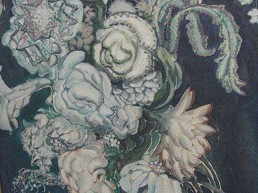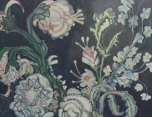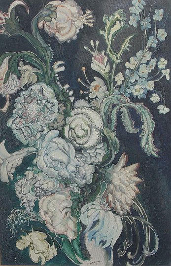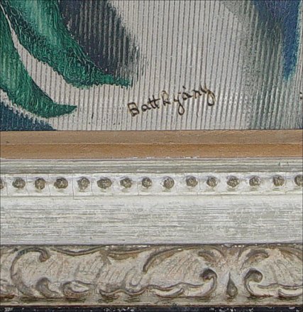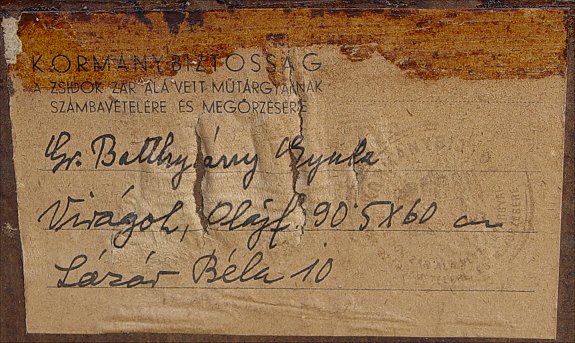 BATTHYANY, Gyula, (Hungarian, 1887-1959): Modernist Floral still life, O/Pressed Board, 35 1/2'' x 23 5/8'', signed lower margin, Hungarian gallery label affixed verso, embossed white washed gilded molding, overall 40'' x 27 1/2''. Condition - Needs cleaning, several whisper scrapes with minimal paint loss.