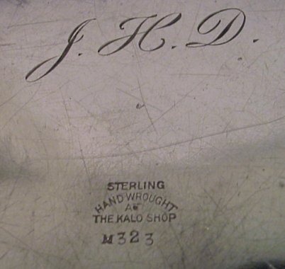 KALO SHOPS HAND WROUGHT STERLING BOWL: Die stamped ''Hand Wrought at the Kalo Shop'', M323. Several small dents. 1 1/4'' x 9 3/4'' dia. Approx. 14.56 oz.