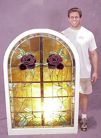 ANTIQUE ARCHITECTURAL ROSE MOTIF STAINED GLASS WINDOW: Arched shape in wooden white painted frame. Dominate colors are red, amber, and green. 60''h, 40 1/2''w.