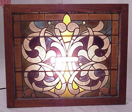 ANTIQUE OAK FRAMED FLEUR DE LIS STAINED GLASS WINDOW: Amber, turquoise, and purple with green faceted bulls-eyes. 27'' x 32''.
