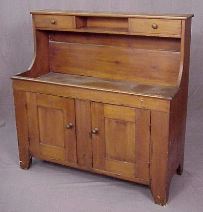 EARLY 19TH C CHERRY TALL BACK DRY SINK: 2 drawer upright, deep basin over a 2 door lower cabinet with chamfered paneled doors. Nice wide board construction. Ca. 1820