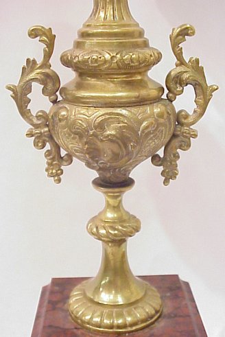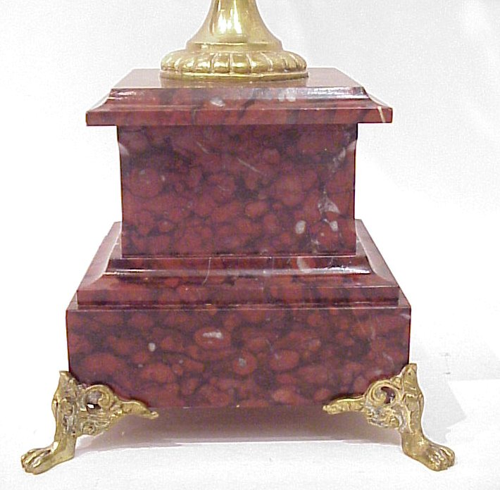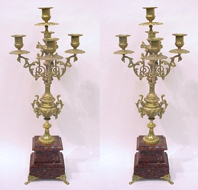 19th C MARBLE BASE CANDELABRUM: 5 light brass candleholders on a red marble base. 23''h.
