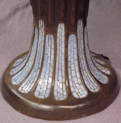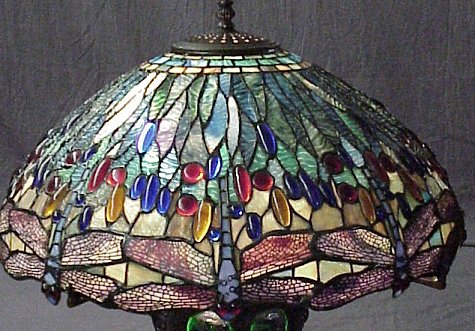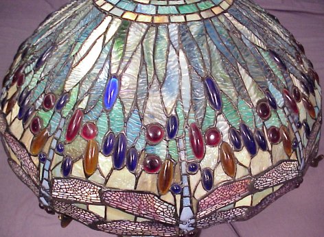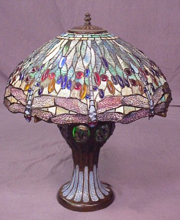 DRAGONFLY TIFFANY STYLE TABLE LAMP: The bronze base is fitted with iridised medallions and mosaic tiles in blue. The shade is a dramatic frieze of dragonflies and red cabochons. Approx. 28''h. overall, the shade is 23 1/2'' dia. Est. 850/950**