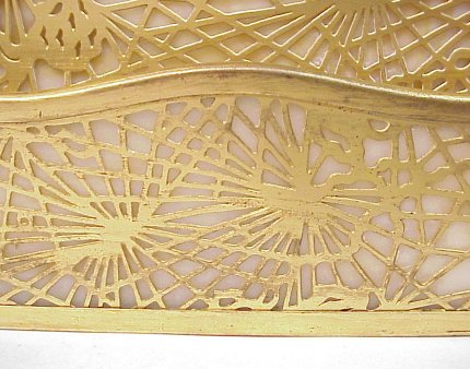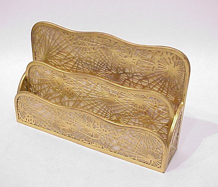TIFFANY STUDIOS ''PINE NEEDLE'' LETTER RACK: 1008. Caramel colored glass in dore' bronze. 6 1/8''h, 10''l. No cracks in the glass.