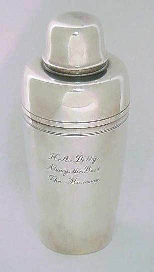 TIFFANY & CO. STERLING COCKTAIL SHAKER: 1 pint, 7''h. Engraved ''Hello Dolly Always the Best The Musicman''. Impressed Tiffany & Co Makers. Approx. 13.11 oz.