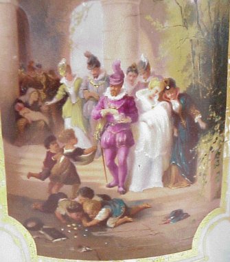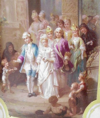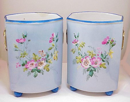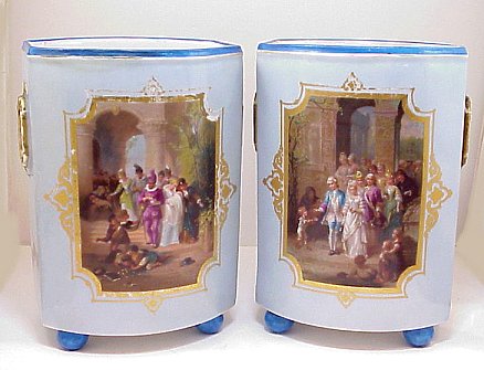 PR SEVRES QUALITY OLD PARIS PORCELAIN CACHEPOTS: Hand painted floral decorations to one side. Enhanced French scenes depicting formally attired couples in the costumes of the period with children playing. Gilt handles to the side, each pot on 4 ball feet, late 19th C, 11 1/4'' h.