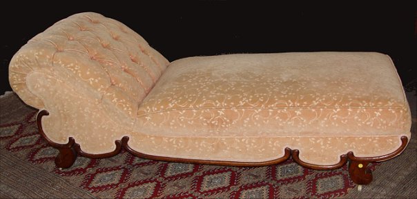 VICTORIAN GOLDEN OAK DAY BED: Late 19th C. Golden oak frame and scrolled feet. 6'l. 30''w. Tufted back rest, sculpted brushed cotton fabric ready for shop or home.