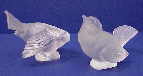 TWO LALIQUE CRYSTAL SPARROWS: One with head tucked under his wing, signed ''Lalique France'' in block letters. The other with his head raised, signed in script ''Lalique France''. Each approx. 4 1/2''l. Free from chips and cracks.