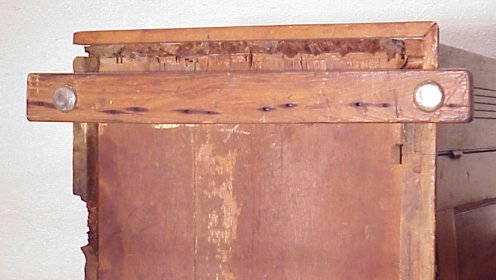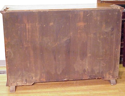 EARLY, PERIOD STEP BACK WALL CUPBOARD: Upper section is open hutch cupboard with shaped frame. Straight molded cornice. Bottom section is 3 drawers over 2 door cupboard doors. 86''h x 57 ½''w x 20''. Est. $2500/3500**