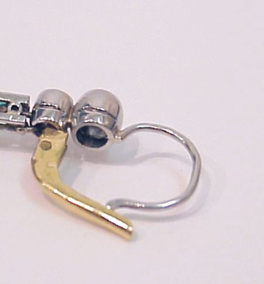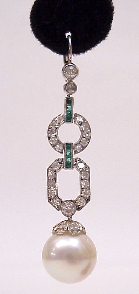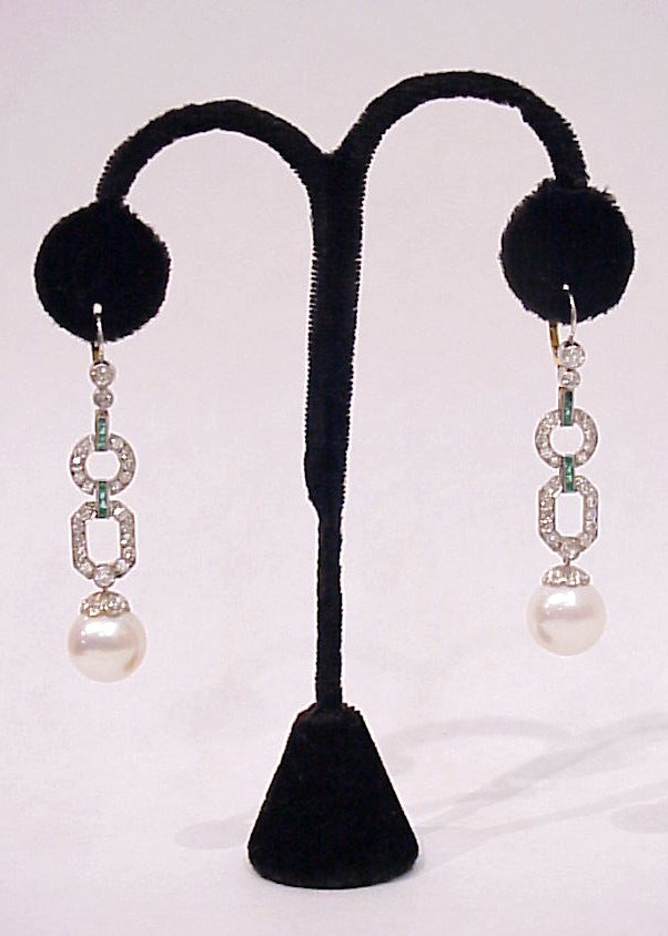 DIAMOND, EMERALD, PEARL & PLATINUM DROP EARRINGS: Stunning bezel set diamonds drop to emerald hinge leading to diamond encrusted loops and octagon to diamond capped 13mm pearls, 2 3/8''l. Est. $3200/3800**