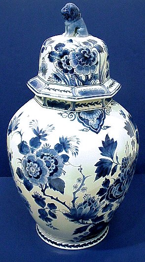 LARGE DELFT COVERED JAR / VASE: Ginger jar with lion finial. 20''H.