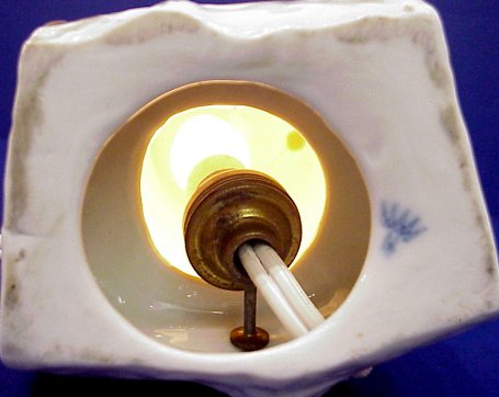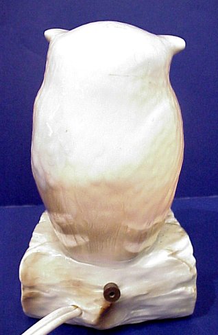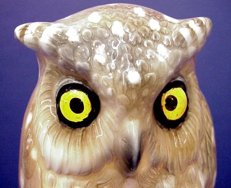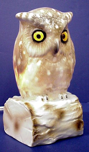 CAPO DI MONTE PORCELAIN MINIATURE OWL LAMP: Large glass eyes on this fine porcelain figural lamp in the form of an owl on a log. Blue mark under glaze. 6 1/2''h. No chips or cracks.
