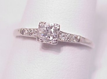 DELICATE DIAMOND RING: Approx. 30pt (4.4mm x 2.8mm) center diamond corner set in 14k white gold mount with two small diamonds to each shoulder, size 10.
