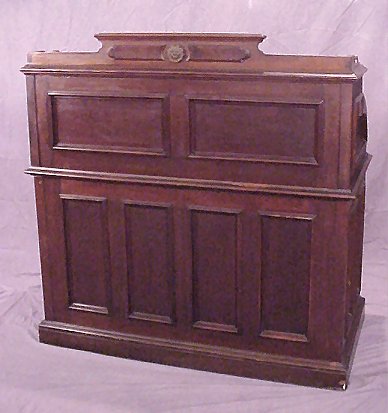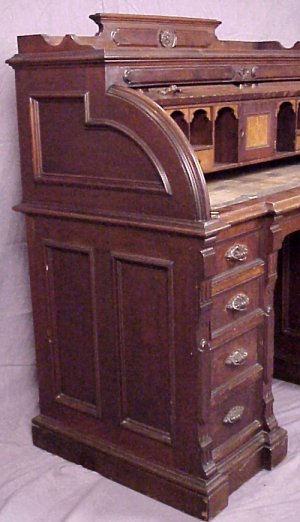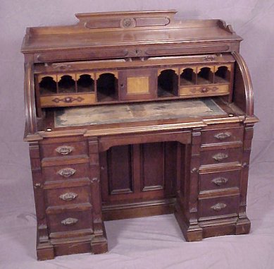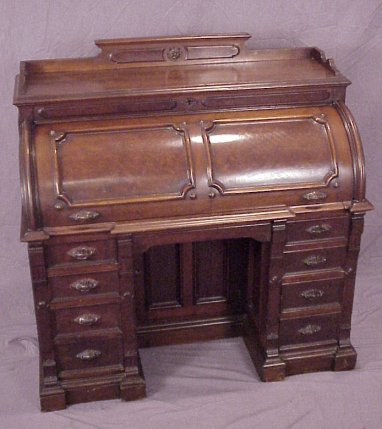WOOTON QUALITY VICTORIAN CYLINDER ROLL DESK: Bird's-eye, and tiger maple accented interior, uniquely shaped valanced cubbies. Slide out writing surface over double pedestal base. Each pedestal having 4 drawers with carved pulls. Center cabinet with door under slide. Carpathian elm burl to cylinder and lattice applique to interior drawer fronts. 50''h x 49''w x 26''.