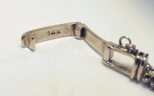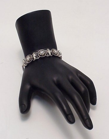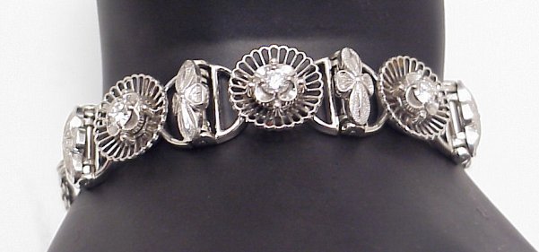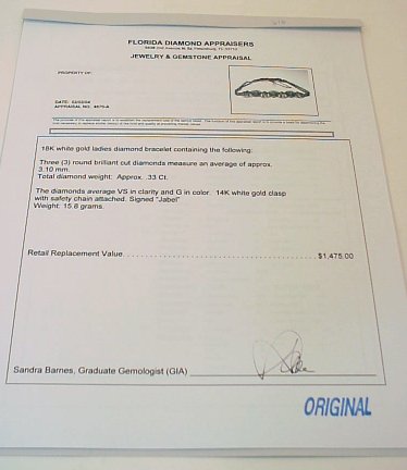 LOVELY DIAMOND BRACELET BY JABEL: 18k white gold bracelet with floral and foliate links, each of the three flowers set with round brilliant cut diamond, approx. 1/3ctw, G color and VS clarity, 14k gold clasp and safety chain, 15.8 grams, approx. 6 1/2''l. Sold with current appraisal, retail replacement $1475**