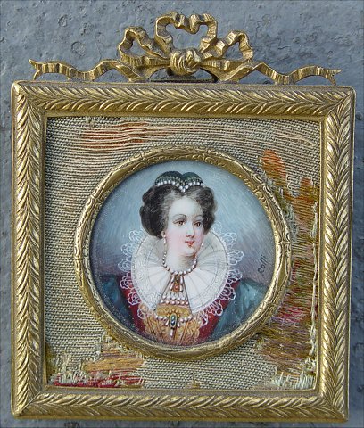 19TH C? PORTRAIT OF ROYALTY, W/C ON IVORY: 1 1/4''dia., signed right Rolli, encased in gilded metal frame with needlepoint matting.