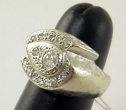 UNISEX WHITE GOLD AND DIAMOND RING: Reminiscent of a paisley eye, hand etched 14k white gold mount encrusted with diamonds, main stone approx. 1/3ct, size 5 3/4.