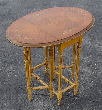 PAINT DECORATED DIMINUTIVE DROP LEAF TABLE: First quarter 20th C, banded satin wood top with hand painted floral garlands over eight legged gate leg base. Fluted tapered legs with stylized acanthus leaf crest. Oval top with gilt bead decoration. 24''h x 27'' oval.