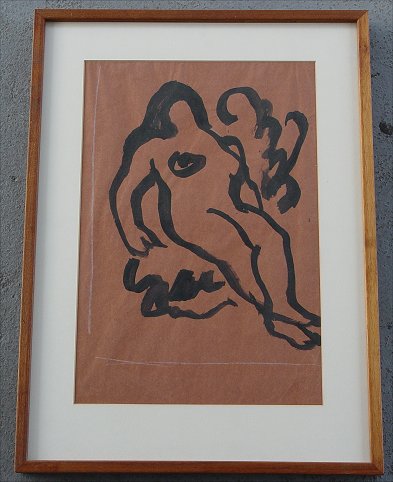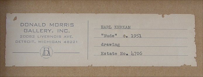 KERKAM, Earl, (American, 1890-1965): ''Nude'', Ink Drawing, 16 1/2'' x 11 1/4'', Donald Morris Gallery Detroit Mich label affixed verso with title. Earl Kerkham studied at the Rand School, the Art Student's League and the School of Design. He designed for the Stanley Company and Warner Brothers and was art editor of Progress. In 1924 he went to Paris and studied at the Academies de la Grand Chaumiere and Academy Colorisie. He was in charge of the exhibits at the American Art Gallery in Paris. His work was exhibited at the Museum of Modern Art, the Corcoran Art Gallery, Art Institute of Chicago and the Mellon Galleries. His clients included the Herald Tribune, the Brooklyn Eagle and the Red Stallion Press. Credit: Dr. Leslie Project. Est. $600/800**