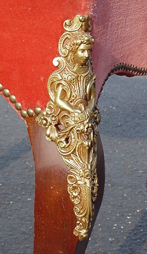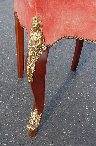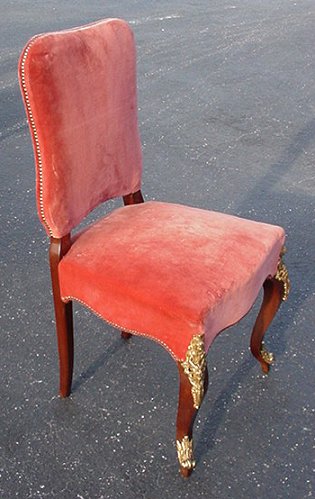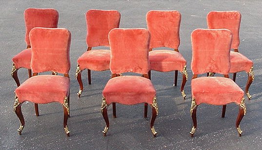 SET OF 7 LOUIS XVI STYLE SIDE CHAIRS: Featuring lady head ormolu mounts on the knees of the cabriole legs. Velvet upholstered backs and seats. 36''h. 21''w. 19'' deep.