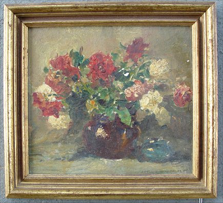WOELFLE, Arthur William, ANA (American, 1873-1936): Floral Still Life, O/B, 9'' x 10'', signed lower right, exhibition information affixed in an envelope verso, encased in original gilded frame, 11 1/4 x 12 1/2''. Condition - Needs cleaning, several chips of paint loss visible in images provided.