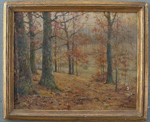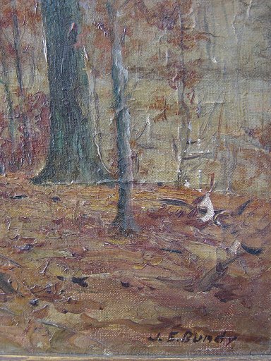 BUNDY, John Elwood, (American, 1853-1933): Autumnal landscape, O/C, 16'' x 20'', signed lower right, encased in period gilded molding, overall 19 1/4'' x 23 1/4''. Condition - Eraser size portion of paint loss in lower left corner, sporadic pin point spots of paint loss throughout, unsettling of paint in lower to mid right margin, sporadic unusual fluorescence - not believed to be in-paint but rather a different pigment, signature reinforced.Elwood studied with Barton Hays, member of the Richmond Art Assoc., Hoosier Salon, exhibited at the Art Inst. of Chicago, Herron, among many others. This scene is amongst his specialties. He was a significant figure in the Indiana art world of the late 1800's. Not only a painter but an instructor. (Falk)