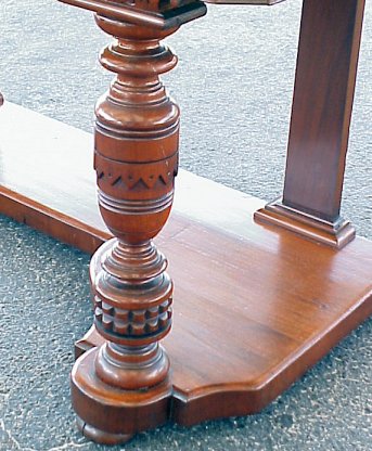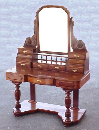 VICTORIAN MAHOGANY DRESSING TABLE: Foyer or dressing table. Carved arms center a slightly arched framed mirror. 6 small drawers and 2 compartments in upper section. Table has one center drawer, turned and carved legs, with lower tier as stretcher. 66''h, overall, x 47 1/2'' x 22''.