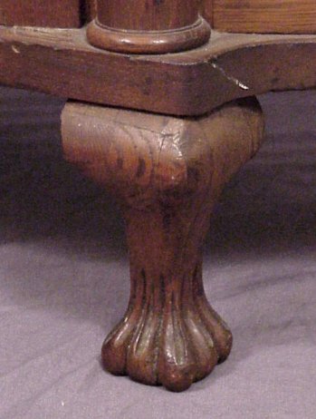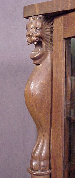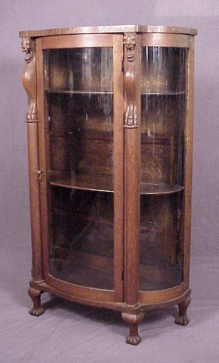 OAK TRIPLE BOWFRONT CHINA CABINET: Ca. turn of the century golden oak. Carved lions head stiles and claw feet. 2 Wooden shelves. 64''h. x 40''w. x 19''d.
