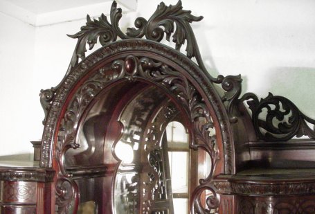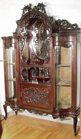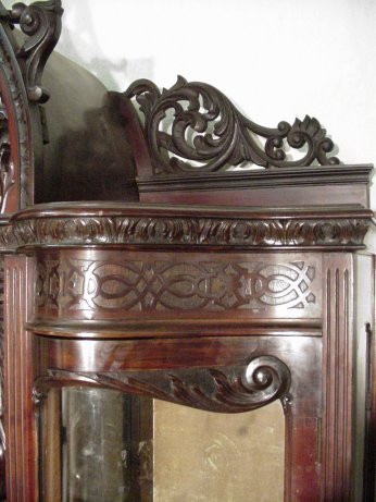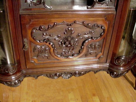 MOST ORNATE EDWARDIAN SERPENTINE GLASS ETAGERE/CURIO CABINET: Ca 1890. Fabulous detailed filigree carving, velvet lined interior, mirrored backsplash and on and on and on... The best we've ever sold! 91''h x 60''w x 18''