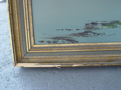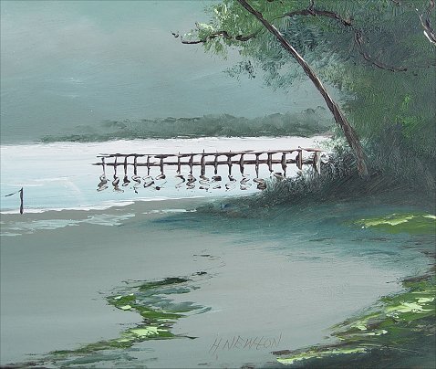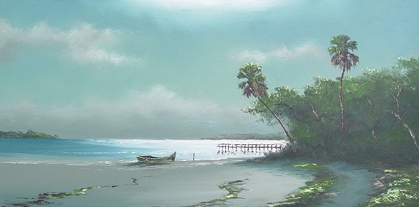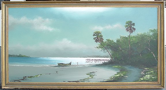 NEWTON, Harold, (Amer., 20th C.): Florida Highwaymen Coastal Scene, O/Crescent Board, 24'' x 48'', SLR, encased in later frame with damage lower left. Condition- Circular area in the center/right sky 2'' diameter of inpaint.