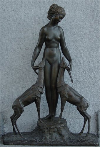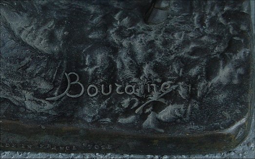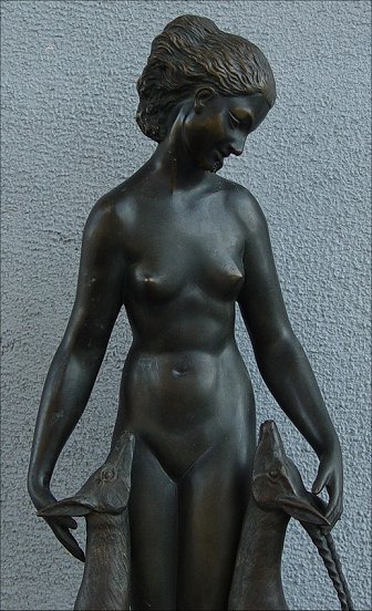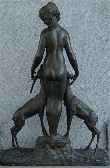 BOURAINE, Marcel, (French, 1886-1948): Nude with 2 Antelope, Bronze, 20 1/4''h, signed on base, LN and JL Paris foundry mark. Condition- wear to patina, several scuffs, visible joint in right arm. Marcel-Andre Bouraine was born in Pontoise (Seine-et Oise), He studied under Jean-Alexndre-Joseph Falguiere (1881 - 1900), who had reintroduced and emphasized realism in nineteenth-century sculpture. Bouraine was captured in Germany during the First World War, and interned in Switzerland. In 1922, he exhibited at the Salon des Tuileries. The following year he began to exhibit at the Salon d'Autommne. He executed small-scale sculptures for several French firms, including Susse Freer, La Verrier, and Arthur Goldscheider, often exhibiting with the latter's La Stele and L'Evolution groups. In 1928 Gabriell Argy-rousseau (1885- 1953) commissioned a number of figurines from Bouraine, mostly female nudes, but also a fountain and an illuminated group, all of which were executed in colored, translucent pate de verre.