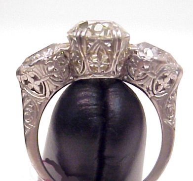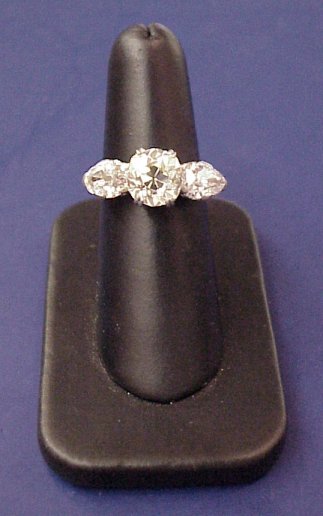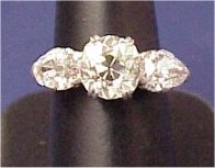 GLORIOUS EDWARDIAN PLATINUM DIAMOND RING: Amazingly almost 6 carat total, centered by 3.37ct Lisbon cut, K VVS, flanked by Old Euro Pear cut diamonds, H/I color, approx. 1ct each, in a circa 1905 Edwardian filigree platinum mount, size 7 1/2, approx. 7 grams. Est. $25000/30000**