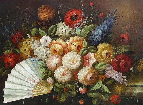 19TH C ? FRENCH O/C STILL LIFE OF FLOWERS AND FAN: 29'' x 39 1/4'', no visible signature, encased in a contemporary gilded molding, overall 45 1/2'' x 34 3/4''. Condition - Has been relined, small scrape in upper right corner, craquelure throughout.