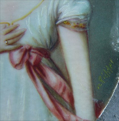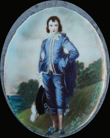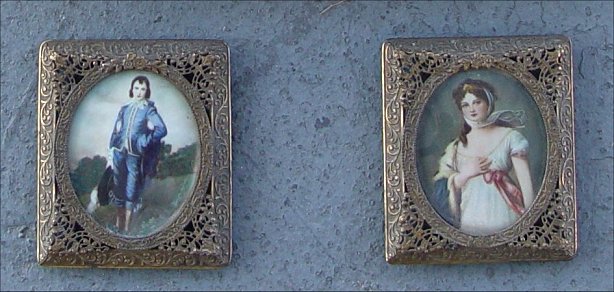 PAIR OF 19th C W/C ON IVORY: One after Gainsborough of the Blue Boy, 2'' x 1 3/4'', the other a Duchess signed lower right N? Richter, 2'' x 1 3/4'', both encased in cast metal filigree frames. The Duchess is of museum quality.