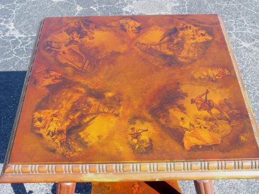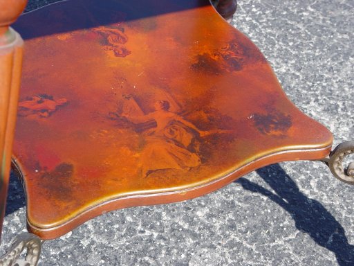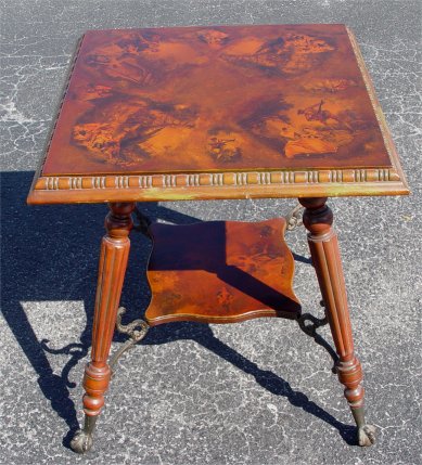 LATE 19TH CENTURY SPLAY LEG LAMP TABLE: Mahogany splay legged table with tapered melon ribbed legs ending with metal ball and claw feet. Scrolled iron supports shaped lower shelf. Unique underglaze decorations depicting French courting scenes to table top and lower shelf. 38'' height, 26'' square.