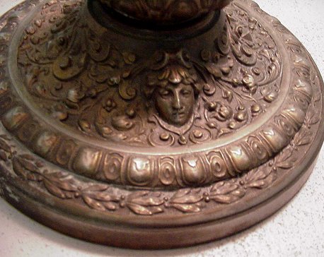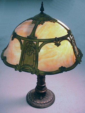 BRADLEY & HUBBARD TABLE LAMP WITH BENT PANEL SLAG GLASS SHADE: The base is decorated with a high relief masqueron motif. The bell shaped shade has panels of bent caramel slag glass with amber glass, 19''dia. Lamp is 26'' h. Three replaced pull chain sockets and rewired for safety. Gilt loss on the shade. Bears the Bradley & Hubbard mark above the sockets.
