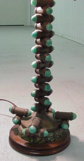 SLAG GLASS BENT PANEL SHADE LAMP: Blue and green slag glass under scenic filagree. Unusual handcrafted ''lipstick'' base. Shade is 18'' dia. please note cracked panel. 25''h.