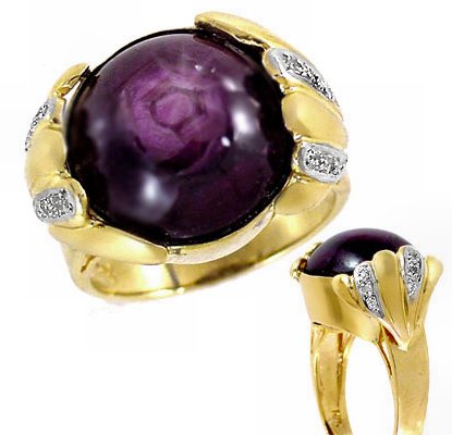 SHINING 6 POINT STAR RUBY RING: This magnificent star ruby cabochon is captured in a unique contemporary style band of 10k yellow gold, accented by diamonds in wings of gold. Approx. 21ct stone, size 7 1/4, 10 grams. Est. $350/400**