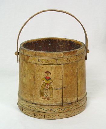 EARLY PAINTED FIRKIN BUCKET: Three banded, paint decorated bucket. Constructed of wooden slats and bands. 11 1/2'' h. 11 1/2'' dia.