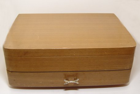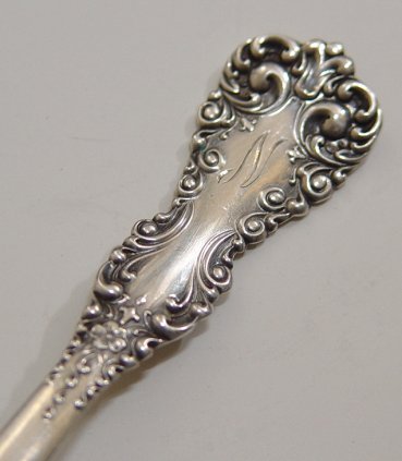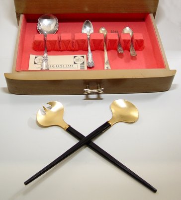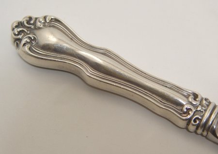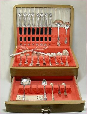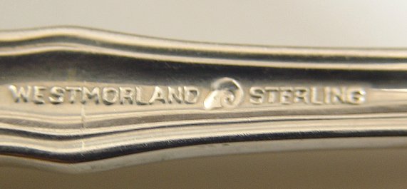 WESTMORLAND STERLING SERVICE FOR 8, ''GEORGE & MARTHA WASHINGTON'' PATTERN: Circa 1940, no monogram. 47 pcs to include knives 8 13/16'', stainless blades, 7 1/8'' dinner forks, 6'' soup spoons, 6'' salad forks, 6'' teaspoons, 7'' master butter, one 6'' sugar shell, three 8 1/4'' serving spoons, gravy ladle 7 1/2'' and salad servers - lucite with sterling handles. In original box, sold with a sterling berry spoon marked with an H in a pennant and six teaspoons marked with profile. Sold as a lot.