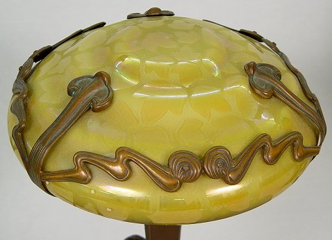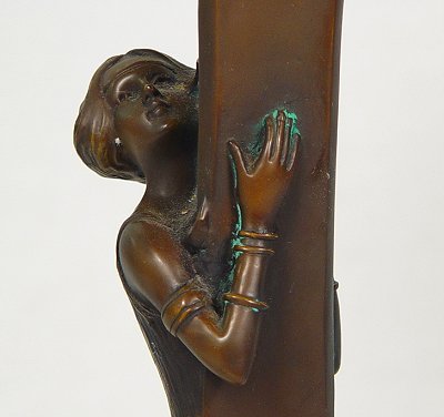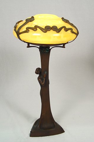 ART NOUVEAU STYLE BRONZE FIGURAL LAMP: Capped with an amber art glass shade. Contemporary manufacture. 23 1/2''h, the shade is 12''h.