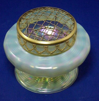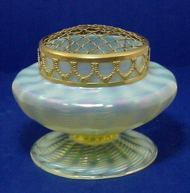 LOETZ VASELINE ART GLASS VASE: Iridised with a touch of opalescence, swirled form. Pedestal vase with gilt metal frog insert. Unsigned, attributed to Loetz. 5''h, 5'' dia. at the widest point.