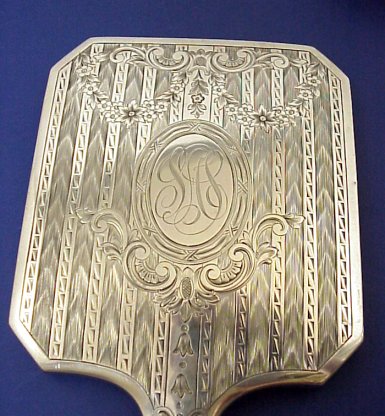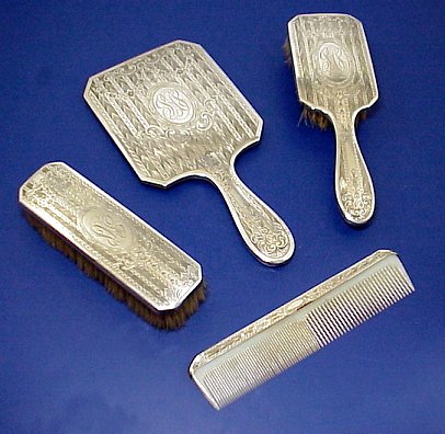 GORHAM 4 PIECE STERLING DRESSER SET CA. 1910: Engraved floral swag design and monogram. The hair brush, hand mirror, and comb bear the date marks for 1910. The clothes brush is dated from 1911. Comes with summary and life achievements ''Grandpa Sullivan'', civil engineer and husband of Sarah Anne for whom the set is monogrammed ''SAS''. Please note beveled mirror has discoloration.