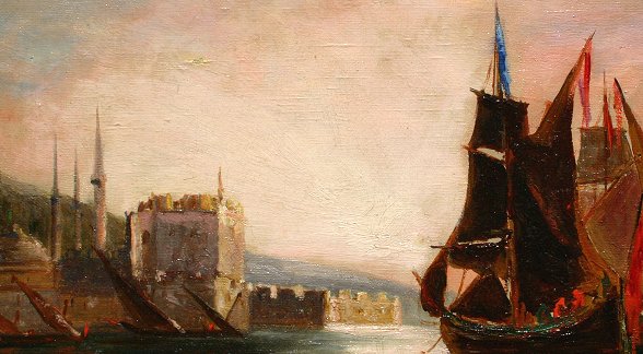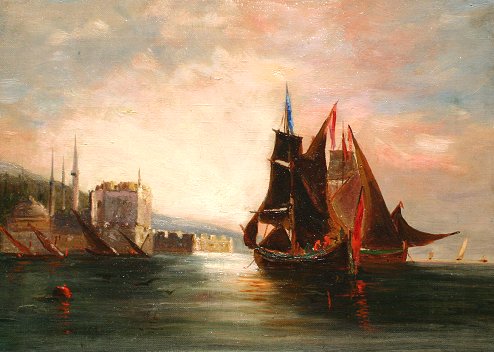 EXCEPTIONAL 19TH CENTURY O/C SHORELINE SCENE WITH FORTRESS AND SAILING VESSELS: O/C, 10'' x 14'', no visible signature. Condition - Needs cleaning, several spots in sky are missing sky and have been in-painted because it needs cleaning, there is a pin hole visible in each of the four corners.