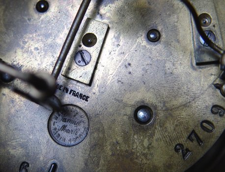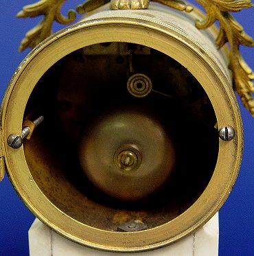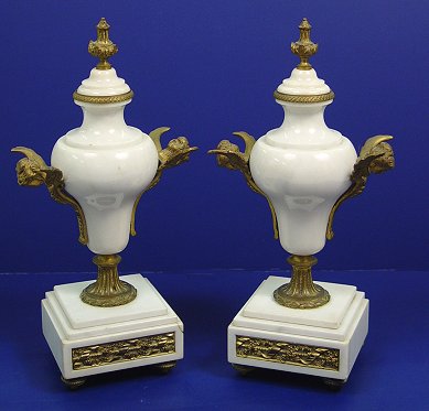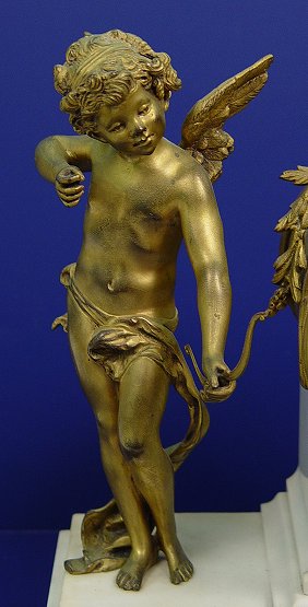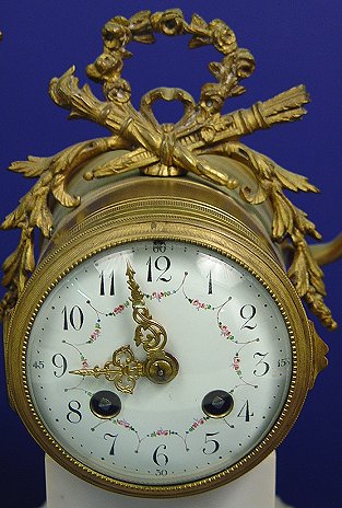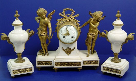 SAMUEL MARTI FRENCH CLOCK GARNITURE: White marble clock and garniture. The clock has two gilt bronze cherub or fairy figures, the garniture is adorned with winged maidenheads. Works are signed Samuel Marti and Made in France, numbered 2709, bell strike and pendulum. The 3 1/2'' dial has hand painted floral swags and ornate brass hands. 11 3/4''h. 12 '' x 5''. The garnitures are 12''h. Please note one corner of the garniture has a small crack. Est. $2500/3000**