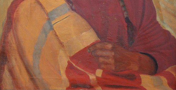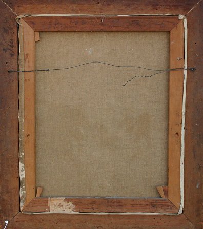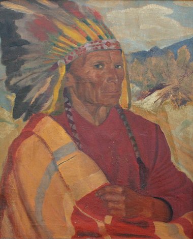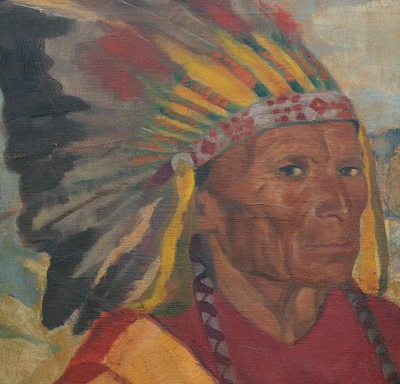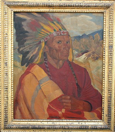 PORTRAIT OF AN INDIAN CHIEF: O/C, 24'' x 20'', no visible signature, bears partial label verso with name typewritten ''Fleck'', and in pencil ''Romero Taos?''. Encased in original period frame bearing an indecipherable signature, *? W, (Woolsey?!). Frame is carved and gilded with pitting throughout and minor wear, of exceptional quality, measures 29 1/4'' x 25 1/2''. Condition - Craquelure throughout, several pin point flecks of paint loss, needs cleaning. Est. $1000/1500**