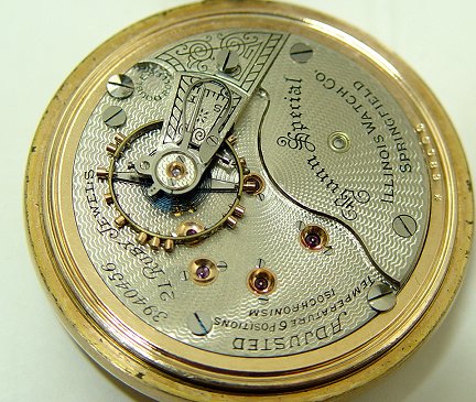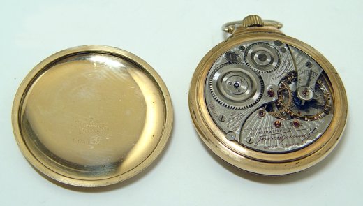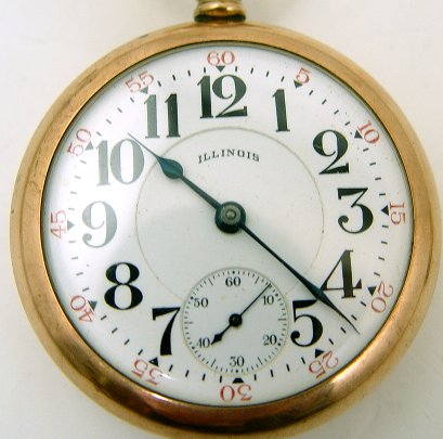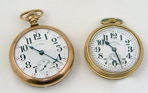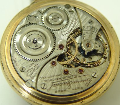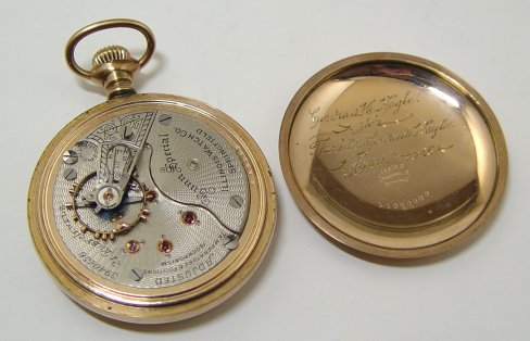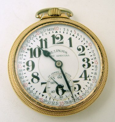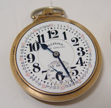 ILLINOIS BUNN SPECIAL POCKET WATCHES: First we have a 60hr 23jewel pocket watch with works adjusted temp. and 6 positions, open face 10k gold filled case by Star Case Co, #8614513, currently keeping time, lever set, works serial #5216901 - dating it approx. 1929, face marked Illinois Bunn Special 23 Jewel 60 Hour, approx. 2''dia. overall, crystal could use replacing. Original price $65, current book value $1300. Sold with a 21 ruby jewel adjusted Temperature 6 positions isochronism, double roller, #3940456 - dating it approx. 1922, needs cleaning - not keeping time, gold filled case by Dueber, #11060089, monogrammed inside back ''Conrad H Nagle to Franklin Conrad Nagle April 4 1925'', approx. 2 1/4''dia. overall.