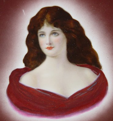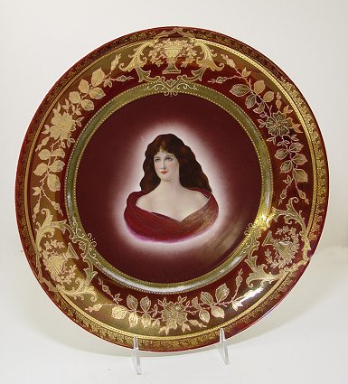 BEE HIVE MARK VIENNA PORTRAIT PLATE: Gilt decorated border center image of a raven haired beauty. Marked with blue bee hive and ''Austria'', 13 3/8'' dia. Please note worn gold and scratch to surface.