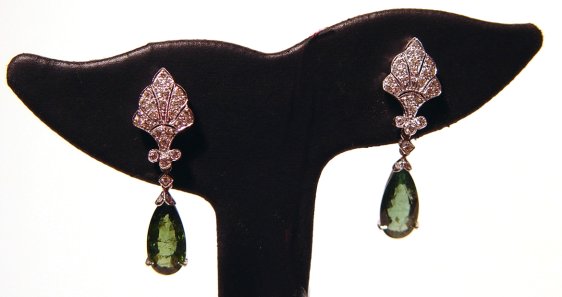 AMAZING TOURMALINE & DIAMOND EARRINGS: Lovely green tourmalines in a narrow drop briolette cut, 5.59ctw dangling from fan shaped diamond encrusted, .50ctw, post back earrings of 18k white gold. Added feature is the option of easily removing the drops for diamond fan only or use of a different drop. Large backs for secure display, 5/8'' top or 1 7/16'' overall, 6.3 grams.