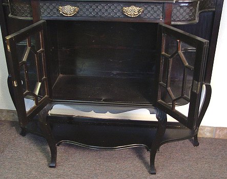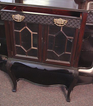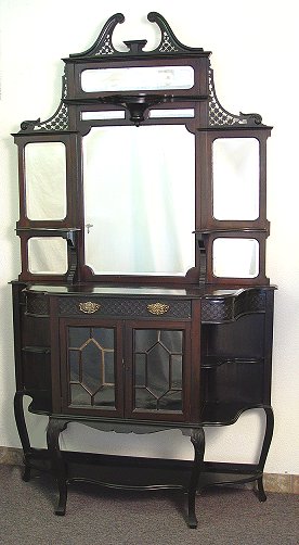 EDWARDIAN STYLE MAHOGANY ETAGERE: Mirrored back sideboard, one drawer over glass front doors, cabriole legs. Please call for condition. 7'h, x 4'l x 14 1/2''. Est. $800/900**